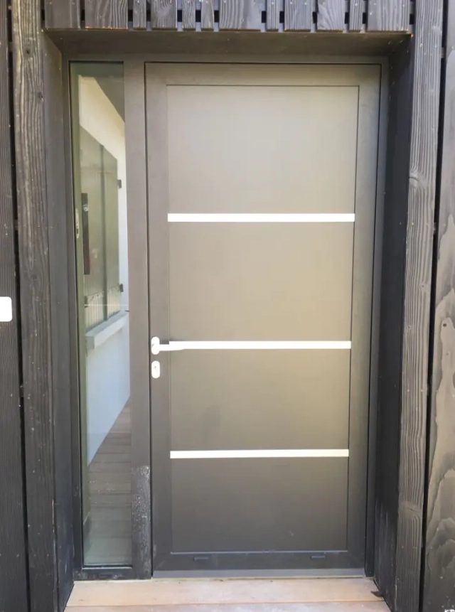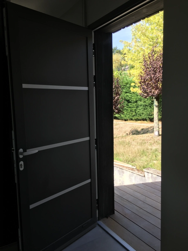 Fabrication et pose Menuiseries Aluminium teinte NOIR 2100 SABLE de la marque TECHNAL, mise en place de Brise-Soleil Orientables teinte NOIR SABLE, de stores enrouleurs occultants intérieurs et de volets bois extérieurs.